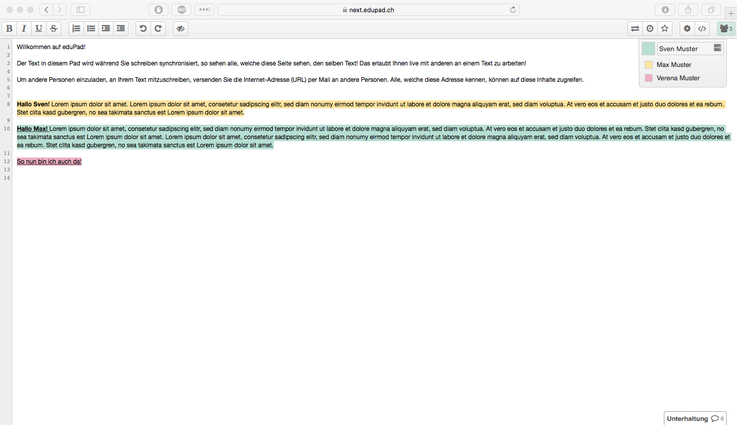 Auf edupad.ch können Seiten mit Textinhalten erstellt werden. Das System beruht auf auf der OpenSource-Plattform EtherPad. Einzelne Pads können kostenlos erstellt und genutzt werden. Eine Anmeldung oder Registrierung ist nicht notwendig. Die Plattform wird betrieben von: